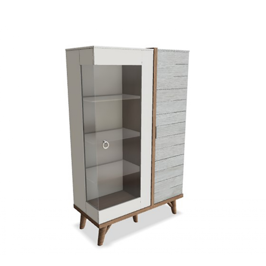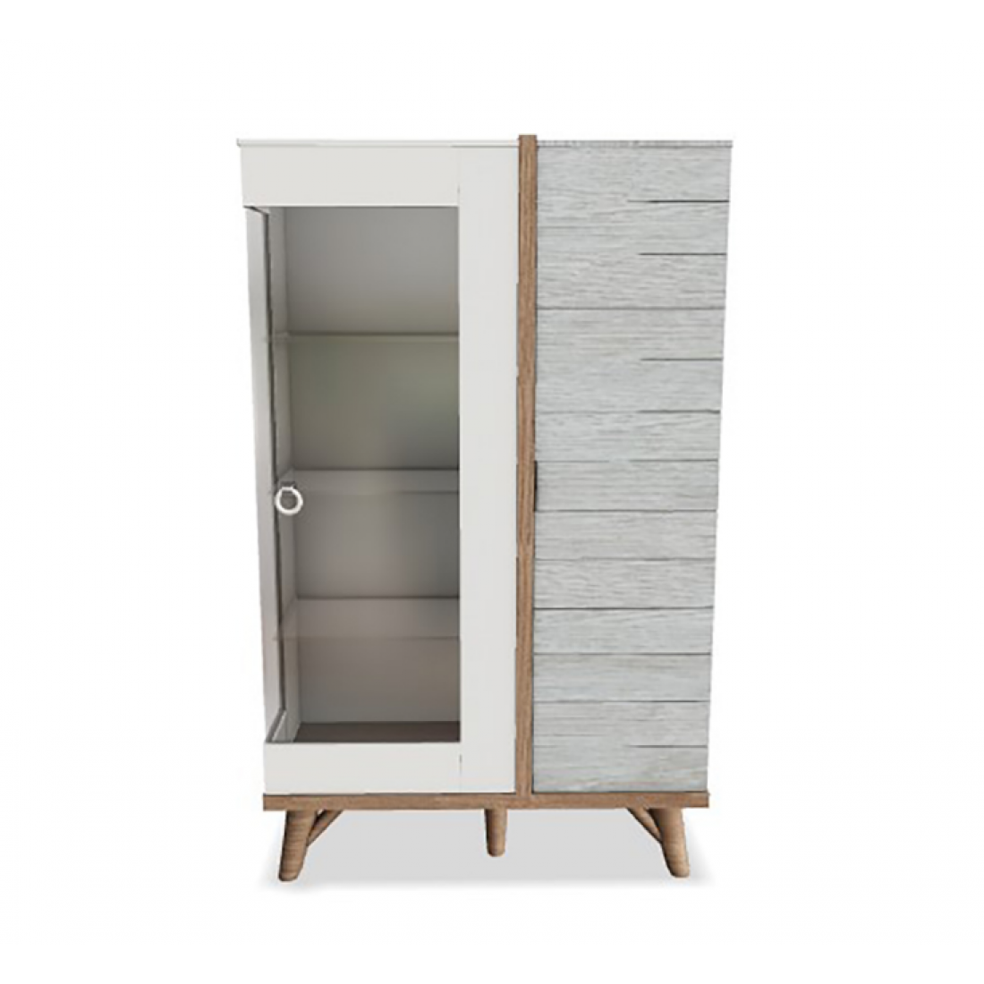 Двухдверная витрина для посуды и столовых принадлежностей из серии Mavenna выполнена в сочетании цветов данной серии: молочно-белый, серый с горизонтальной имитацией досок, цоколь на ножках и разделитель- в цвете орех. Стеклянные полки позволят выставить красивую посуду или коллекцию на обозрение. Высокие ножки облегчают уборку.