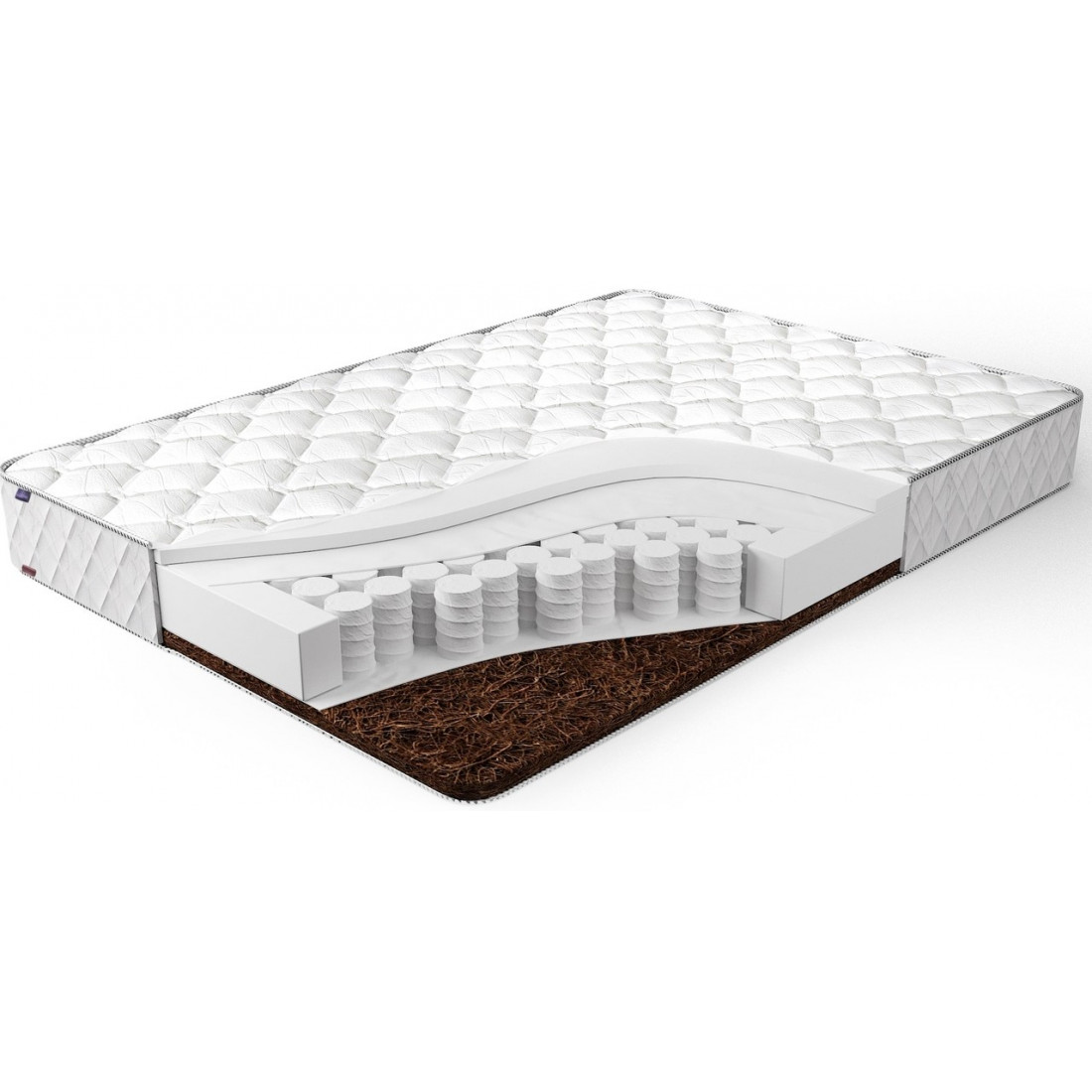Наполнение: независимый блок TFK, высота блока 140 мм, ортопена 20 мм с одной стороны (зима), кокосовая плита 20 мм с другой стороны (лето), износостойкий спанбонд с двух сторон, усиление по периметру - короб из ортопены.