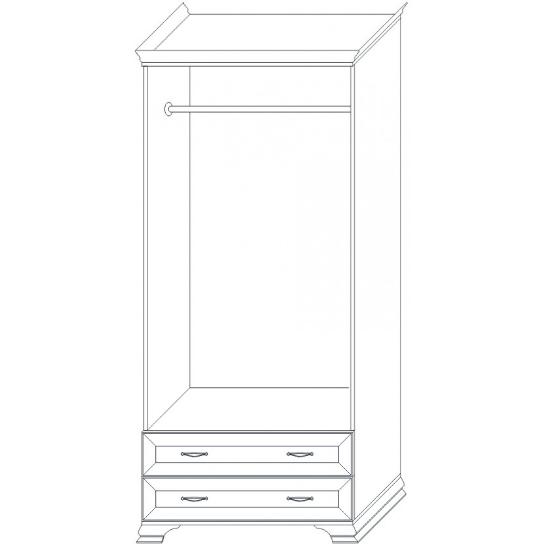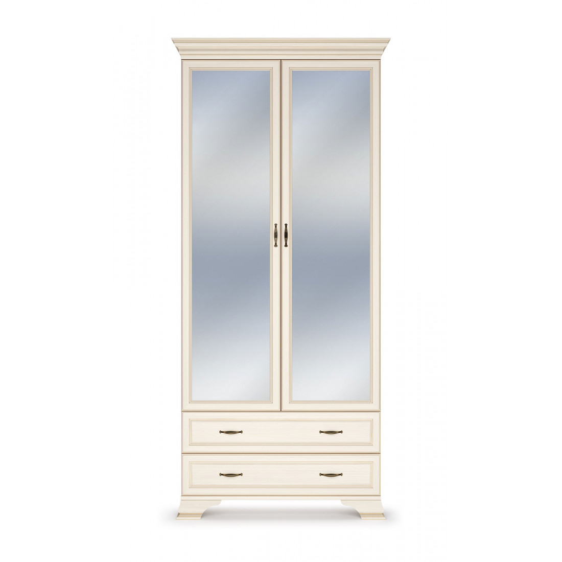 Для Шкафа применяется ЛДСП и МДФ в цвете «бодега белый» с эффектом патинирования золотом. Облик дополняют рамочные фасады и карниз в классическом стиле, а также эффектные опоры из МДФ.