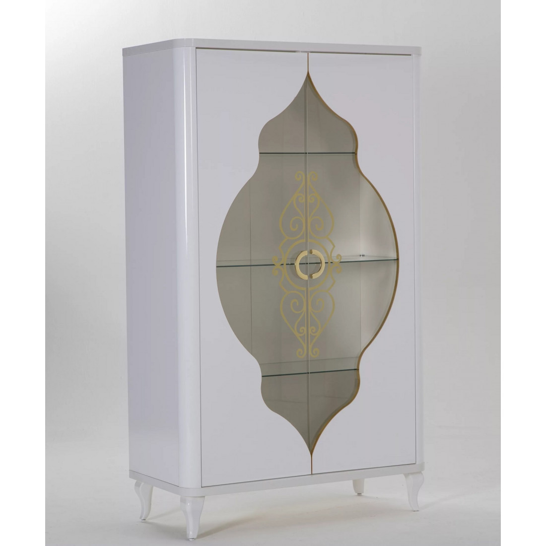 Дизайн шкафа для посуды "Легенда" определенно заслуживает Вашего внимания. Изделие представлено в классическом белом стиле с золотистыми рисунками на стеклянных дверцах и белыми изогнутыми сужающимися к полу ножками. За счет использования высококачественных материалов, удалось добиться долговечности данного изделия.